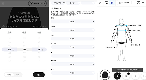 VIRTUSIZEは、身長・体重だけでなく、肩幅やウエスト、ヒップなど細かいサイズを入力して、自分に合うサイズを提案してくれる便利なツールです。